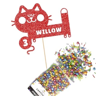 Cakeshop Cake Decoration Pack Cute Cat Birthday Premium Double Sided Glitter Card Topper Sign & 25g Party of Sugar Sprinkles Custom Name Age Decorations (Red)