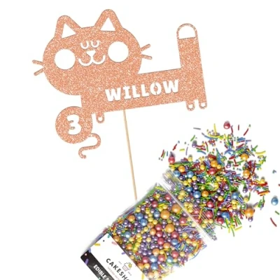 Cakeshop Cake Decoration Pack Cute Cat Birthday Premium Double Sided Glitter Card Topper Sign & 25g Party of Sugar Sprinkles Custom Name Age Decorations (Rose Gold)