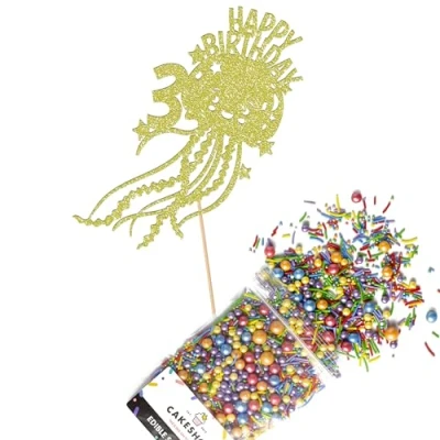 This Cakeshop Cake Decorating Pack includes 1 x 480gsm Double Sided Glitter Card Topper & 25g Cake Sprinkles (option to upgrade to 50g while customising) - perfect for your party or celebration! Cakeshop Sprinkles are Vegan, Gluten Free, Lactose free and Nut Free, all while looking amazing in striking colours and an assortment of sizes for a truly 'premium' finish Size: Sprinkles pack (perfect for a large cake) 25g, you can also upgrade to a 50g pack when customising your topper | Glitter Topper Approx 152mm (6") x 175mm (7") Toppers make a great keepsake to remember this special occasion forever, often our customers will remove the support sick and use on bedroom doors (until their next birthday!) Cakeshop Glitter Toppers are made from 480gsm premium double sided glitter card, select which colour topper you'd like then click 'Customise' to add your text personalisation and choose your sprinkles Choose from either Metallic or Rainbow sprinkles and upgrade to 50g packs in the 'Customise' section, so that you can match your sprinkles to your theme (or save them for next time!) All 'Cakeshop Cake Decorating Packs' come beautifully packed with simple to understand instructions so that you can quickly turn any cake, home made or shop bought (we wont tell!) into the perfect cake After you have added your custom information in the 'Customise Now' section our designers hand make your topper in the same font, style and topper colour as the design you've selected Cakeshop have been making the highest quality Cake Decorations since 2011 - we have thousands of design options available in our store for every occasion and theme (click 'visit the cakeshop store' above) It should go without saying - but Glitter Card toppers are flamable! We therefore recommend using only Acrylic toppers alongside candles for safety