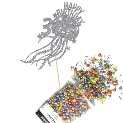 This Cakeshop Cake Decorating Pack includes 1 x 480gsm Double Sided Glitter Card Topper & 25g Cake Sprinkles (option to upgrade to 50g while customising) - perfect for your party or celebration! Cakeshop Sprinkles are Vegan, Gluten Free, Lactose free and Nut Free, all while looking amazing in striking colours and an assortment of sizes for a truly 'premium' finish Size: Sprinkles pack (perfect for a large cake) 25g, you can also upgrade to a 50g pack when customising your topper | Glitter Topper Approx 152mm (6") x 175mm (7") Toppers make a great keepsake to remember this special occasion forever, often our customers will remove the support sick and use on bedroom doors (until their next birthday!) Cakeshop Glitter Toppers are made from 480gsm premium double sided glitter card, select which colour topper you'd like then click 'Customise' to add your text personalisation and choose your sprinkles Choose from either Metallic or Rainbow sprinkles and upgrade to 50g packs in the 'Customise' section, so that you can match your sprinkles to your theme (or save them for next time!) All 'Cakeshop Cake Decorating Packs' come beautifully packed with simple to understand instructions so that you can quickly turn any cake, home made or shop bought (we wont tell!) into the perfect cake After you have added your custom information in the 'Customise Now' section our designers hand make your topper in the same font, style and topper colour as the design you've selected Cakeshop have been making the highest quality Cake Decorations since 2011 - we have thousands of design options available in our store for every occasion and theme (click 'visit the cakeshop store' above) It should go without saying - but Glitter Card toppers are flamable! We therefore recommend using only Acrylic toppers alongside candles for safety