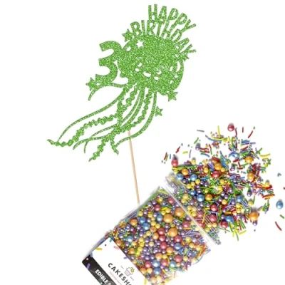 Cakeshop Cake Decoration Pack Cute Jellyfish Birthday Premium Double Sided Glitter Card Topper Sign & 25g Party of Sugar Sprinkles Custom Age Decorations (Green)