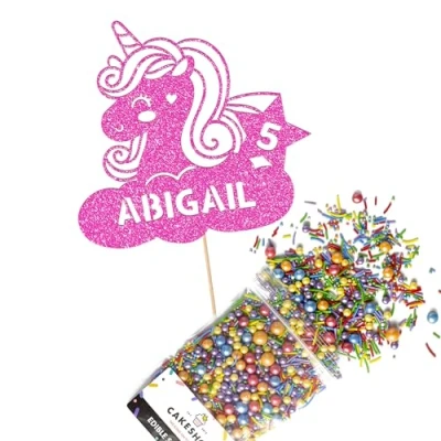 Cakeshop Cake Decoration Pack Cute Unicorn Premium Double Sided Glitter Card Topper Sign & 25g Party of Sugar Sprinkles Custom Name Age Decorations (Baby Pink)