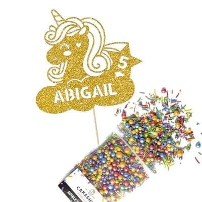 Cakeshop Cake Decoration Pack Cute Unicorn Premium Double Sided Glitter Card Topper Sign & 25g Party of Sugar Sprinkles Custom Name Age Decorations (Gold)
