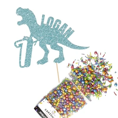 Cakeshop Cake Decoration Pack Dinosaur Birthday Premium Double Sided Glitter Card Topper Sign & 25g Party of Sugar Sprinkles Custom Name Age Decorations (Baby Blue)