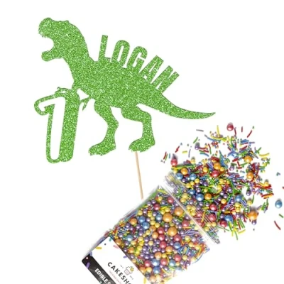 Cakeshop Cake Decoration Pack Dinosaur Birthday Premium Double Sided Glitter Card Topper Sign & 25g Party of Sugar Sprinkles Custom Name Age Decorations (Green)