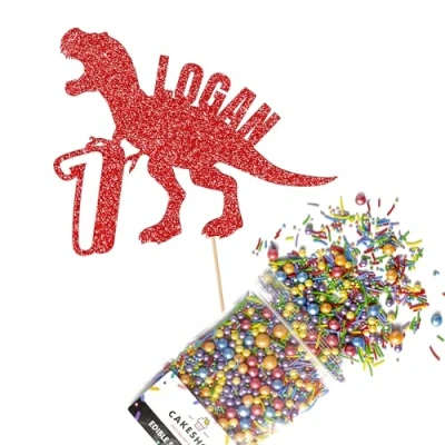 Cakeshop Cake Decoration Pack Dinosaur Birthday Premium Double Sided Glitter Card Topper Sign & 25g Party of Sugar Sprinkles Custom Name Age Decorations (Red)