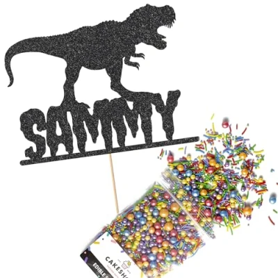 Cakeshop Cake Decoration Pack Dinosaur Theme Birthday Premium Double Sided Glitter Card Topper Sign & 25g Party of Sugar Sprinkles Custom Name Decorations (Black)