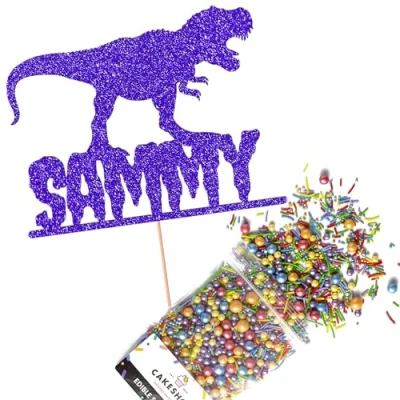 Cakeshop Cake Decoration Pack Dinosaur Theme Birthday Premium Double Sided Glitter Card Topper Sign & 25g Party of Sugar Sprinkles Custom Name Decorations (Bright Blue)