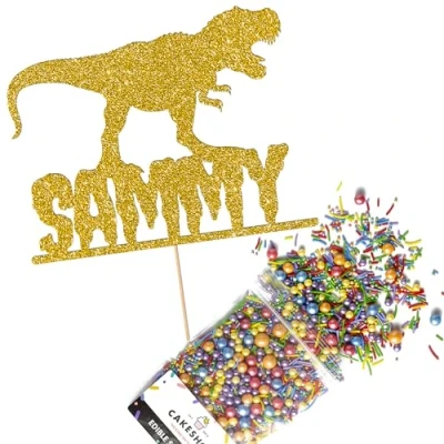 Cakeshop Cake Decoration Pack Dinosaur Theme Birthday Premium Double Sided Glitter Card Topper Sign & 25g Party of Sugar Sprinkles Custom Name Decorations (Gold)