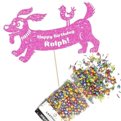 Cakeshop Cake Decoration Pack Dog Theme Happy Birthday Premium Double Sided Glitter Card Topper Sign & 25g Party of Sugar Sprinkles Custom Name (Baby Pink)