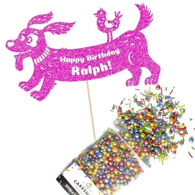Cakeshop Cake Decoration Pack Dog Theme Happy Birthday Premium Double Sided Glitter Card Topper Sign & 25g Party of Sugar Sprinkles Custom Name (Bright Pink)