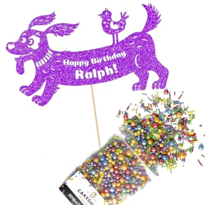 Cakeshop Cake Decoration Pack Dog Theme Happy Birthday Premium Double Sided Glitter Card Topper Sign & 25g Party of Sugar Sprinkles Custom Name (Purple)