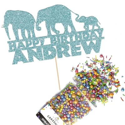 Cakeshop Cake Decoration Pack Elephant Jungle Birthday Premium Double Sided Glitter Card Topper Sign & 25g Party of Sugar Sprinkles Custom Name (Baby Blue)