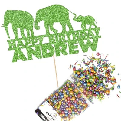 Cakeshop Cake Decoration Pack Elephant Jungle Birthday Premium Double Sided Glitter Card Topper Sign & 25g Party of Sugar Sprinkles Custom Name (Green)