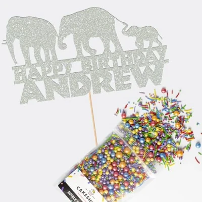 Cakeshop Cake Decoration Pack Elephant Jungle Birthday Premium Double Sided Glitter Card Topper Sign & 25g Party of Sugar Sprinkles Custom Name (Light Silver)