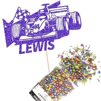 Cakeshop Cake Decoration Pack F1 Formula 1 Racing Car Premium Double Sided Glitter Card Topper & 25g Party of Sugar Sprinkles Custom Name Decorations (Bright Blue)
