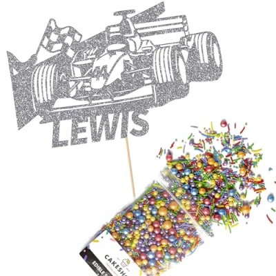Cakeshop Cake Decoration Pack F1 Formula 1 Racing Car Premium Double Sided Glitter Card Topper & 25g Party of Sugar Sprinkles Custom Name Decorations (Dark Silver)