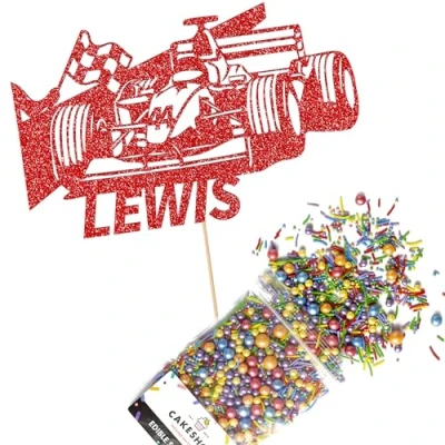 Cakeshop Cake Decoration Pack F1 Formula 1 Racing Car Premium Double Sided Glitter Card Topper & 25g Party of Sugar Sprinkles Custom Name Decorations (Red)