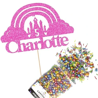 Cakeshop Cake Decoration Pack Fairy Princess Castle Premium Double Sided Glitter Card Topper & 25g Party of Sugar Sprinkles Custom Name Age Decorations (Baby Pink)