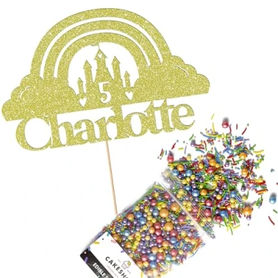 Cakeshop Cake Decoration Pack Fairy Princess Castle Premium Double Sided Glitter Card Topper & 25g Party of Sugar Sprinkles Custom Name Age Decorations (Champagne)