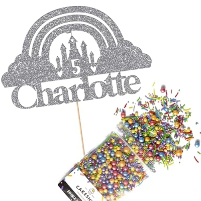 Cakeshop Cake Decoration Pack Fairy Princess Castle Premium Double Sided Glitter Card Topper & 25g Party of Sugar Sprinkles Custom Name Age Decorations (Dark Silver)