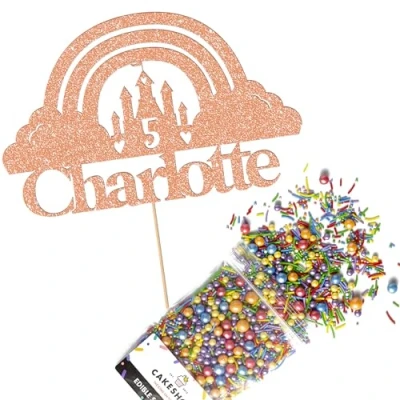 Cakeshop Cake Decoration Pack Fairy Princess Castle Premium Double Sided Glitter Card Topper & 25g Party of Sugar Sprinkles Custom Name Age Decorations (Rose Gold)