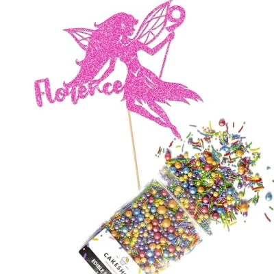 Cakeshop Cake Decoration Pack Fairy Princess Premium Double Sided Glitter Card Topper Sign & 25g Party of Sugar Sprinkles Custom Name Age Decorations (Baby Pink)