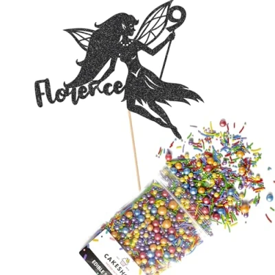 Cakeshop Cake Decoration Pack Fairy Princess Premium Double Sided Glitter Card Topper Sign & 25g Party of Sugar Sprinkles Custom Name Age Decorations (Black)