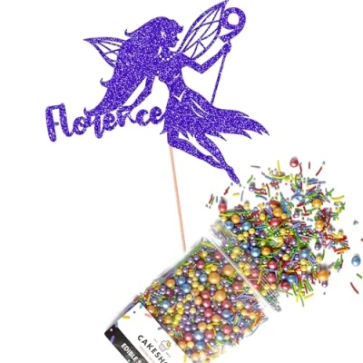 Cakeshop Cake Decoration Pack Fairy Princess Premium Double Sided Glitter Card Topper Sign & 25g Party of Sugar Sprinkles Custom Name Age Decorations (Bright Blue)