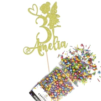 Cakeshop Cake Decoration Pack Fairy Princess Premium Double Sided Glitter Card Topper Sign & 25g Party of Sugar Sprinkles Custom Name Age Decorations (Champagne)