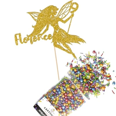 Cakeshop Cake Decoration Pack Fairy Princess Premium Double Sided Glitter Card Topper Sign & 25g Party of Sugar Sprinkles Custom Name Age Decorations (Gold)