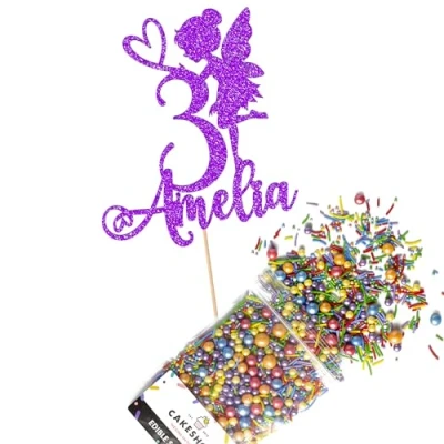 Cakeshop Cake Decoration Pack Fairy Princess Premium Double Sided Glitter Card Topper Sign & 25g Party of Sugar Sprinkles Custom Name Age Decorations (Purple)