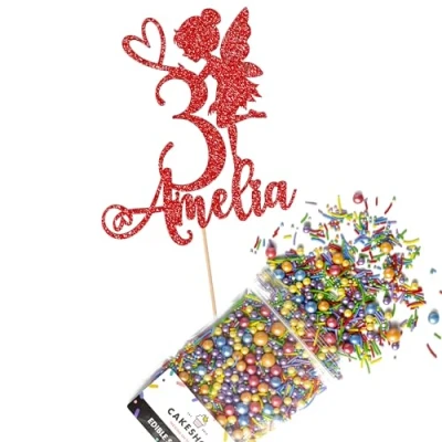 Cakeshop Cake Decoration Pack Fairy Princess Premium Double Sided Glitter Card Topper Sign & 25g Party of Sugar Sprinkles Custom Name Age Decorations (Red)