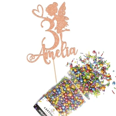 Cakeshop Cake Decoration Pack Fairy Princess Premium Double Sided Glitter Card Topper Sign & 25g Party of Sugar Sprinkles Custom Name Age Decorations (Rose Gold)