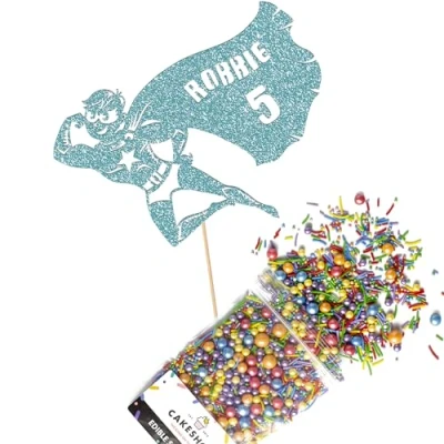 Cakeshop Cake Decoration Pack Flying Superhero Premium Double Sided Glitter Card Topper Sign & 25g Party of Sugar Sprinkles Custom Name Age Decorations (Baby Blue)