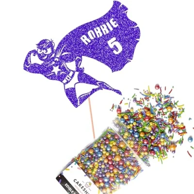 Cakeshop Cake Decoration Pack Flying Superhero Premium Double Sided Glitter Card Topper Sign & 25g Party of Sugar Sprinkles Custom Name Age Decorations (Bright Blue)