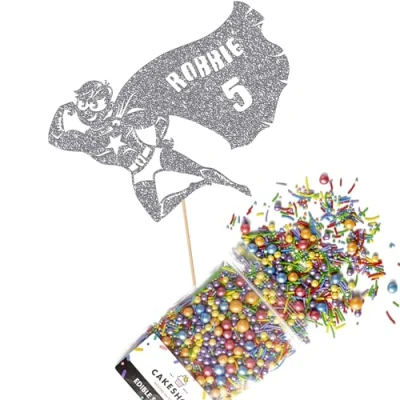 Cakeshop Cake Decoration Pack Flying Superhero Premium Double Sided Glitter Card Topper Sign & 25g Party of Sugar Sprinkles Custom Name Age Decorations (Dark Silver)
