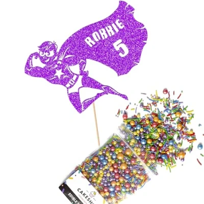 Cakeshop Cake Decoration Pack Flying Superhero Premium Double Sided Glitter Card Topper Sign & 25g Party of Sugar Sprinkles Custom Name Age Decorations (Purple)