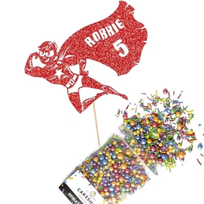 Cakeshop Cake Decoration Pack Flying Superhero Premium Double Sided Glitter Card Topper Sign & 25g Party of Sugar Sprinkles Custom Name Age Decorations (Red)
