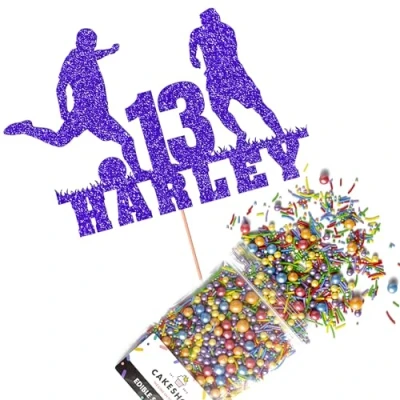 Cakeshop Cake Decoration Pack Football Birthday Theme Premium Double Sided Glitter Card Topper & 25g Party of Sugar Sprinkles Custom Name Age (Bright Blue)
