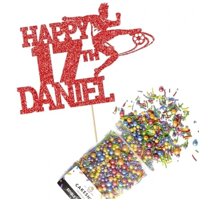 Cakeshop Cake Decoration Pack Football Birthday Theme Premium Double Sided Glitter Card Topper & 25g Party of Sugar Sprinkles Custom Name Age (Red)