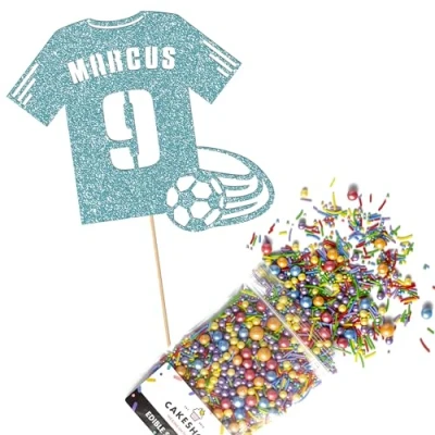 Cakeshop Cake Decoration Pack Football Shirt Birthday Premium Double Sided Glitter Card Topper & 25g Party of Sugar Sprinkles Custom Name Age (Baby Blue)
