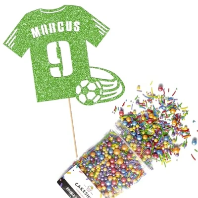 Cakeshop Cake Decoration Pack Football Shirt Birthday Premium Double Sided Glitter Card Topper & 25g Party of Sugar Sprinkles Custom Name Age (Green)