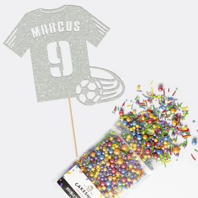 Cakeshop Cake Decoration Pack Football Shirt Birthday Premium Double Sided Glitter Card Topper & 25g Party of Sugar Sprinkles Custom Name Age (Light Silver)