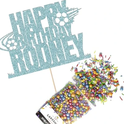 Cakeshop Cake Decoration Pack Football Theme Happy Birthday Premium Double Sided Glitter Card Topper & 25g Party of Sugar Sprinkles Custom Name (Baby Blue)