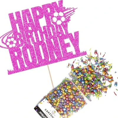 Cakeshop Cake Decoration Pack Football Theme Happy Birthday Premium Double Sided Glitter Card Topper & 25g Party of Sugar Sprinkles Custom Name (Bright Pink)