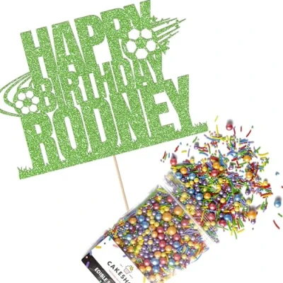 Cakeshop Cake Decoration Pack Football Theme Happy Birthday Premium Double Sided Glitter Card Topper & 25g Party of Sugar Sprinkles Custom Name (Green)
