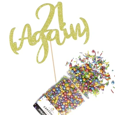 Cakeshop Cake Decoration Pack Funny 21 Again Premium Double Sided Glitter Card Topper Sign & 25g Party of Sugar Sprinkles Custom Age Decorations (Champagne)