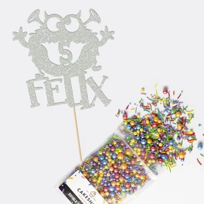 This Cakeshop Cake Decorating Pack includes 1 x 480gsm Double Sided Glitter Card Topper & 25g Cake Sprinkles (option to upgrade to 50g while customising) - perfect for your party or celebration! Cakeshop Sprinkles are Vegan, Gluten Free, Lactose free and Nut Free, all while looking amazing in striking colours and an assortment of sizes for a truly 'premium' finish Size: Sprinkles pack (perfect for a large cake) 25g, you can also upgrade to a 50g pack when customising your topper | Glitter Topper Approx 152mm (6") x 175mm (7") Toppers make a great keepsake to remember this special occasion forever, often our customers will remove the support sick and use on bedroom doors (until their next birthday!) Cakeshop Glitter Toppers are made from 480gsm premium double sided glitter card, select which colour topper you'd like then click 'Customise' to add your text personalisation and choose your sprinkles Choose from either Metallic or Rainbow sprinkles and upgrade to 50g packs in the 'Customise' section, so that you can match your sprinkles to your theme (or save them for next time!) All 'Cakeshop Cake Decorating Packs' come beautifully packed with simple to understand instructions so that you can quickly turn any cake, home made or shop bought (we wont tell!) into the perfect cake After you have added your custom information in the 'Customise Now' section our designers hand make your topper in the same font, style and topper colour as the design you've selected Cakeshop have been making the highest quality Cake Decorations since 2011 - we have thousands of design options available in our store for every occasion and theme (click 'visit the cakeshop store' above) It should go without saying - but Glitter Card toppers are flamable! We therefore recommend using only Acrylic toppers alongside candles for safety