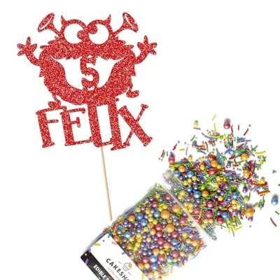This Cakeshop Cake Decorating Pack includes 1 x 480gsm Double Sided Glitter Card Topper & 25g Cake Sprinkles (option to upgrade to 50g while customising) - perfect for your party or celebration! Cakeshop Sprinkles are Vegan, Gluten Free, Lactose free and Nut Free, all while looking amazing in striking colours and an assortment of sizes for a truly 'premium' finish Size: Sprinkles pack (perfect for a large cake) 25g, you can also upgrade to a 50g pack when customising your topper | Glitter Topper Approx 152mm (6") x 175mm (7") Toppers make a great keepsake to remember this special occasion forever, often our customers will remove the support sick and use on bedroom doors (until their next birthday!) Cakeshop Glitter Toppers are made from 480gsm premium double sided glitter card, select which colour topper you'd like then click 'Customise' to add your text personalisation and choose your sprinkles Choose from either Metallic or Rainbow sprinkles and upgrade to 50g packs in the 'Customise' section, so that you can match your sprinkles to your theme (or save them for next time!) All 'Cakeshop Cake Decorating Packs' come beautifully packed with simple to understand instructions so that you can quickly turn any cake, home made or shop bought (we wont tell!) into the perfect cake After you have added your custom information in the 'Customise Now' section our designers hand make your topper in the same font, style and topper colour as the design you've selected Cakeshop have been making the highest quality Cake Decorations since 2011 - we have thousands of design options available in our store for every occasion and theme (click 'visit the cakeshop store' above) It should go without saying - but Glitter Card toppers are flamable! We therefore recommend using only Acrylic toppers alongside candles for safety